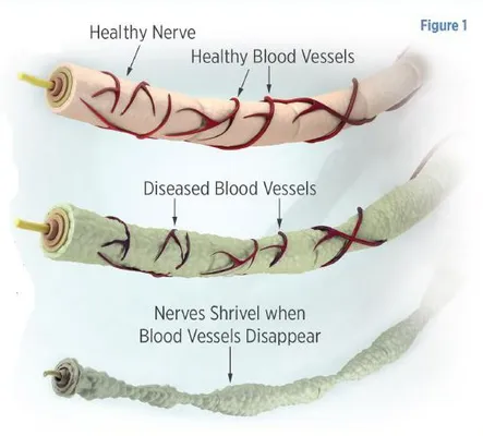 As you can see in Figure 1, as the blood vessels that surround the nerves become diseased, they shrivel up, which causes the nerves to not get the nutrients to continue to survive. When these nerves begin to “die”, they cause balance problems, pain, numbness, tingling, burning, and many additional symptoms.